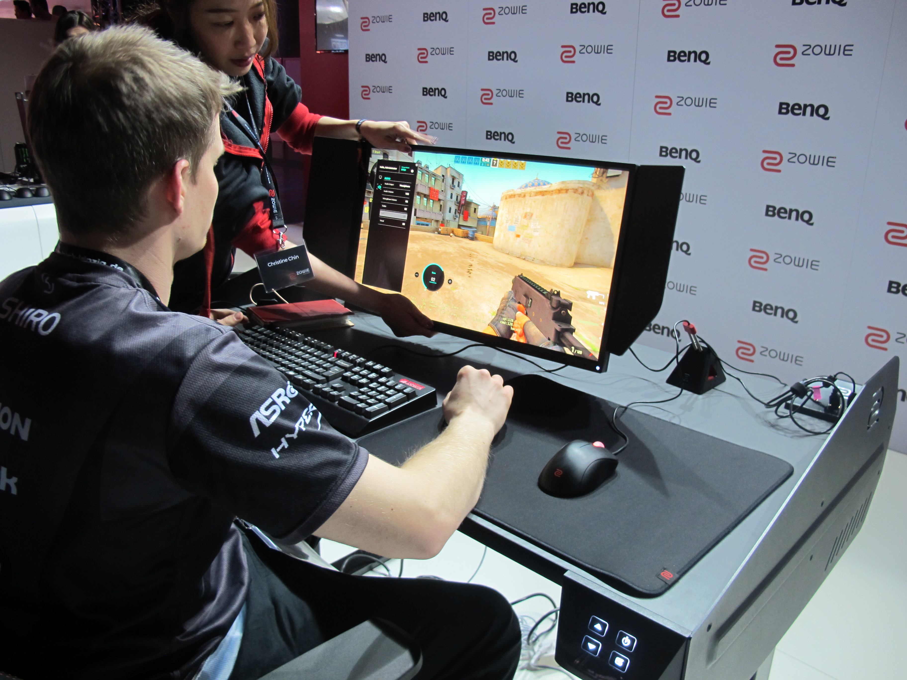 本次比赛的冠军队伍FlipSid3 Tactics也来展台体验ZONE并和我们的美女工作人员合影~
