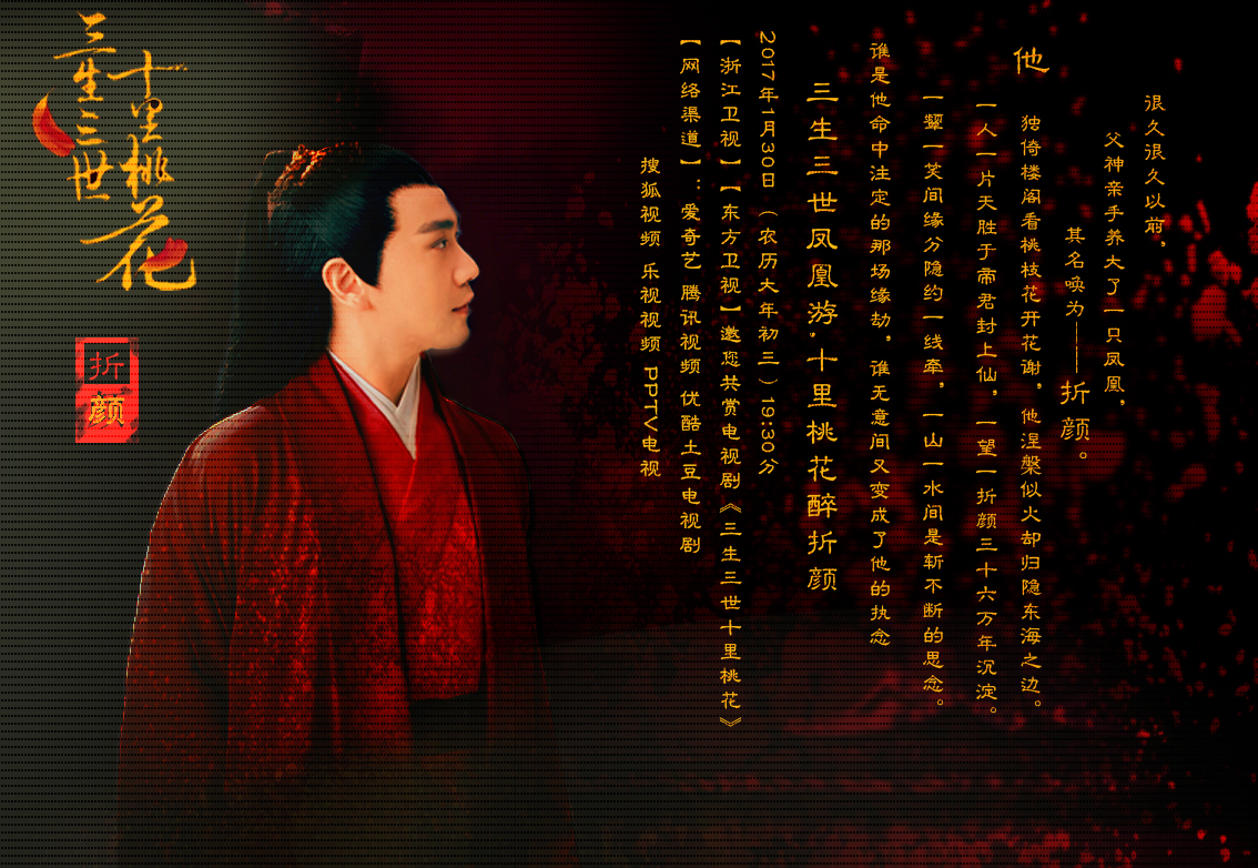 电视剧《三生三世十里桃花》将于1月30日大年初三登陆浙江卫视、东方卫视,并将在优酷、乐视、搜狐、pptv、腾讯、爱奇艺 六大网络平台同步播出。四海八荒齐聚送祝福,朵朵桃花欲盛放。三生三世凤凰游,十里桃花醉折颜。期待您的共同关注!