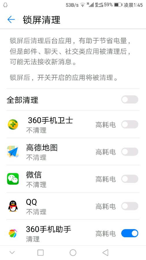 图1,锁屏不会清理360;图2,360程序锁定,自己手动清理也不会关闭;图3,360自我防护已经开启。
