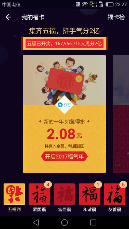 2016年最后一次发帖。集齐五福的你们分了多少。。我集齐两套。一套2.38元