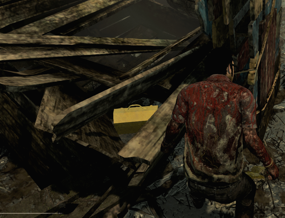 这个比较难,我上次巧合拿出了它,当时蛇皮走位骗电锯屠夫撞到这个位置3次,然后再骗他锤两次,最重要的是紧接着你要在这个位置打击,借着打击你人物的下坠力就能破开,这几个都很关键记得不能搞错顺序,拿到后就可以去拆地下室钩子了