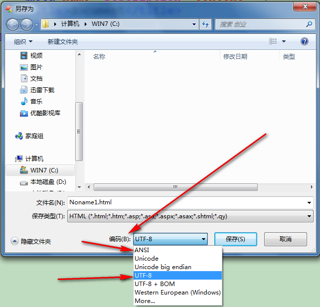 此处,ANSI可以理解它为gb2312(上文中已经提到),UTF-8 + BOM这个不要选。关于BOM的问题,就是说一个文档中,前面多出三个字节,代表这个文档是UTF-8的。咱们只需要知道有这么回事,真正做网页的时候,不会选择这个(UTF-8 + BOM),选了,有时会有问题(比如需要和后台php程序配合时候)。这里不多讲,总之我们记住这一条:保存文件时,可以选择两个编码格式:GN2312(此处为ANSI) 和 UTF-8。现在一般都会选择UTF-8。
