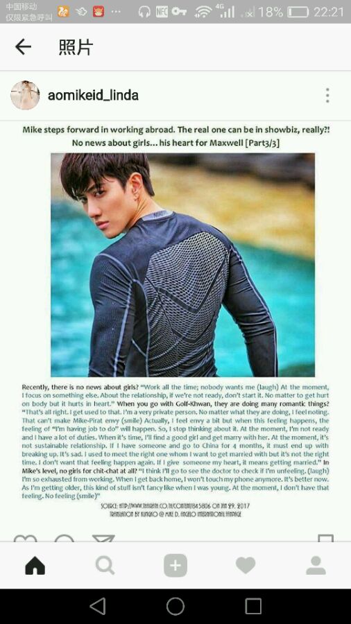 ins上一位泰粉发的,大致我理解为现在没有女朋友,因为有很多工作,然后是还没有准备好,如果找到一个有想照顾她一辈子想法的女孩,到那时就决定结婚了