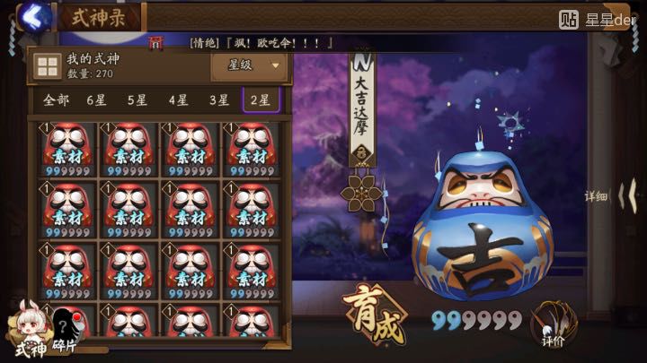 有一个四星狗粮雨女 剩余ssr有阎魔酒吞荒川两面佛 三个四星满白蛋 十个三星满白蛋 16个大吉达摩 4个黑达摩 红达摩数不清 15万金币 1561勾玉
