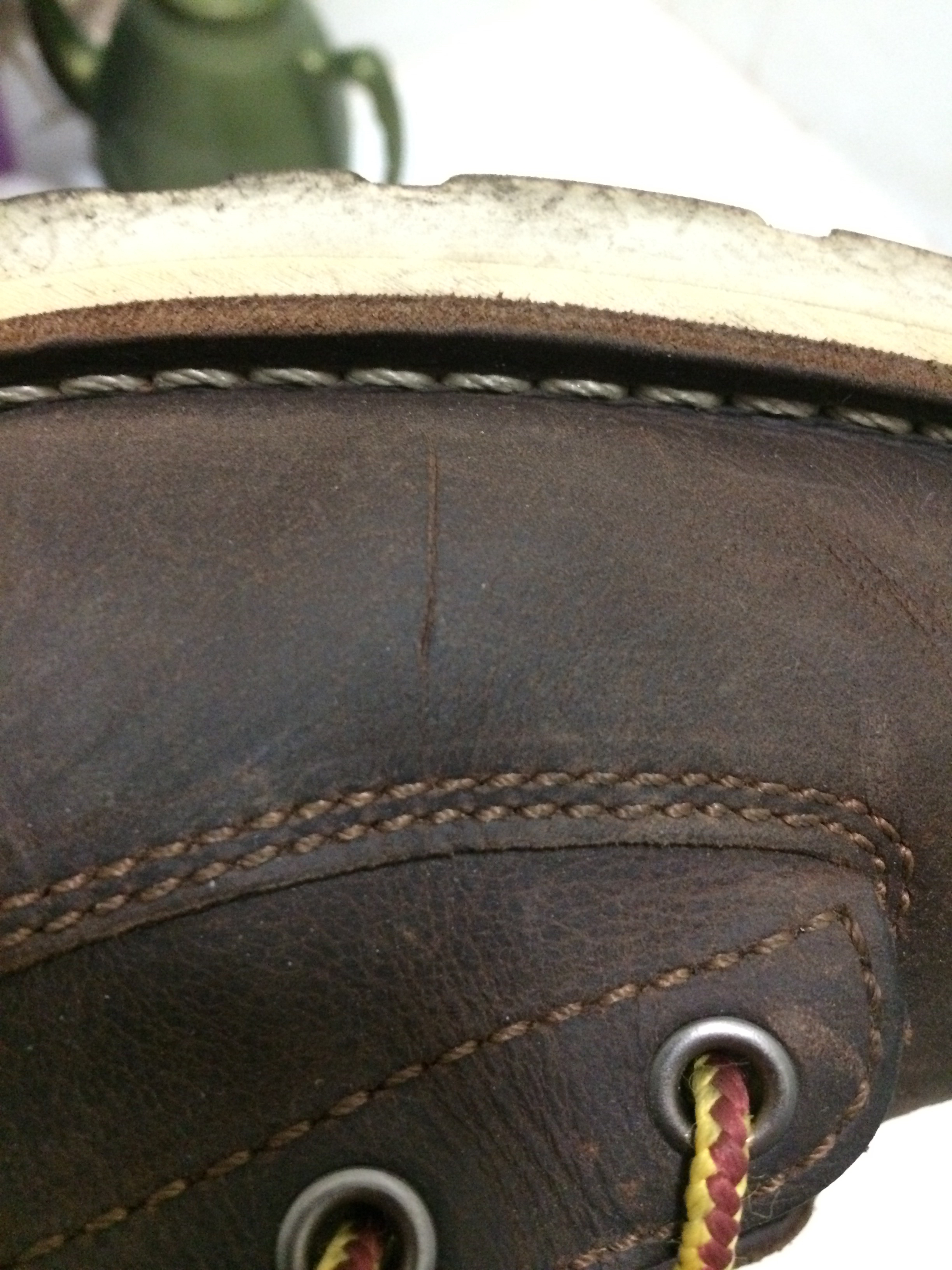 半年没穿,前几天拿出来才发现,莫名其妙左脚鞋头外侧有个被割伤的口子。