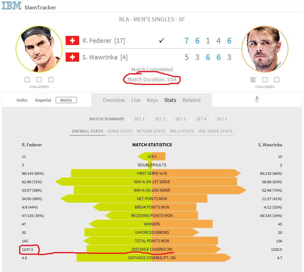 这张图是半决赛对瓦子的比赛数据,艰苦的五盘大战,耗时3小时出头,移动距离却只有1247.30米。两相比较,不难发现,牛对阵瓦子的半决赛虽然艰苦,耗时是对阵大兹维的整一倍,但是跑动距离却只比对阵大兹维时多了70米而已。这或许能很好的解释为什么牛在决赛到了第五盘时体能依然没有太大的下滑。对手的打法决定了牛的跑动距离,大兹维那场虽然耗时不多,三盘结束,但是大兹维网前的截击时而卸力放短,时而