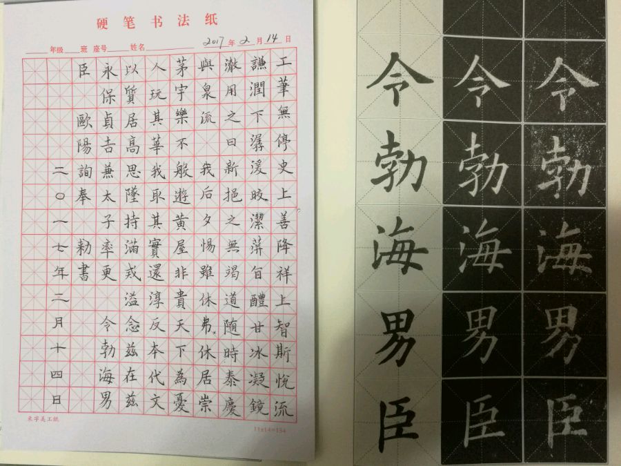 读书时练过会,不过没有怎么临帖,后来丢下了。现在为了教儿子写字,又重新捡起来练字了