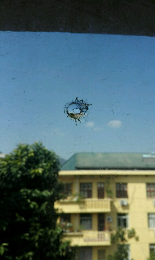 我家楼道的钢化玻璃上也有,确定是从外面打的,关键是我们家在15楼。。。。这威力也太大了吧。