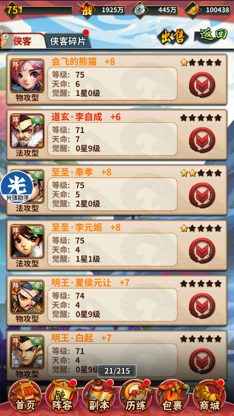 天香阁目前19级 没怎么刷 我都搞不懂那是干嘛的 橙宝不想要 红宝搞不到 刷的东西也是废的 宝物升级不缺那俩 觉醒丹竞技场可以换 1000声望换100划算 竞技场排50名以内就行一天3000声望 再往上也就20名以内多点 没实力别上去