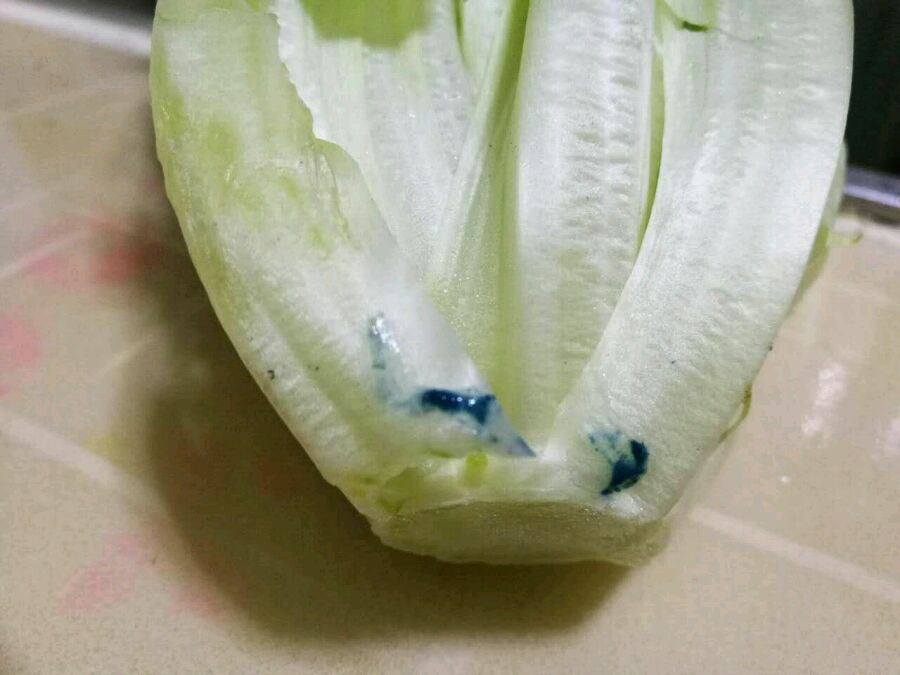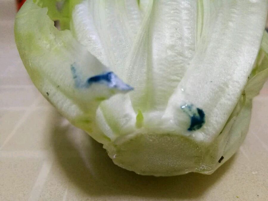 今天在万家利购物,其中有生菜,可回家一拆包装看,这是咋回事呢,有懂的请告之,这蓝色有害没。