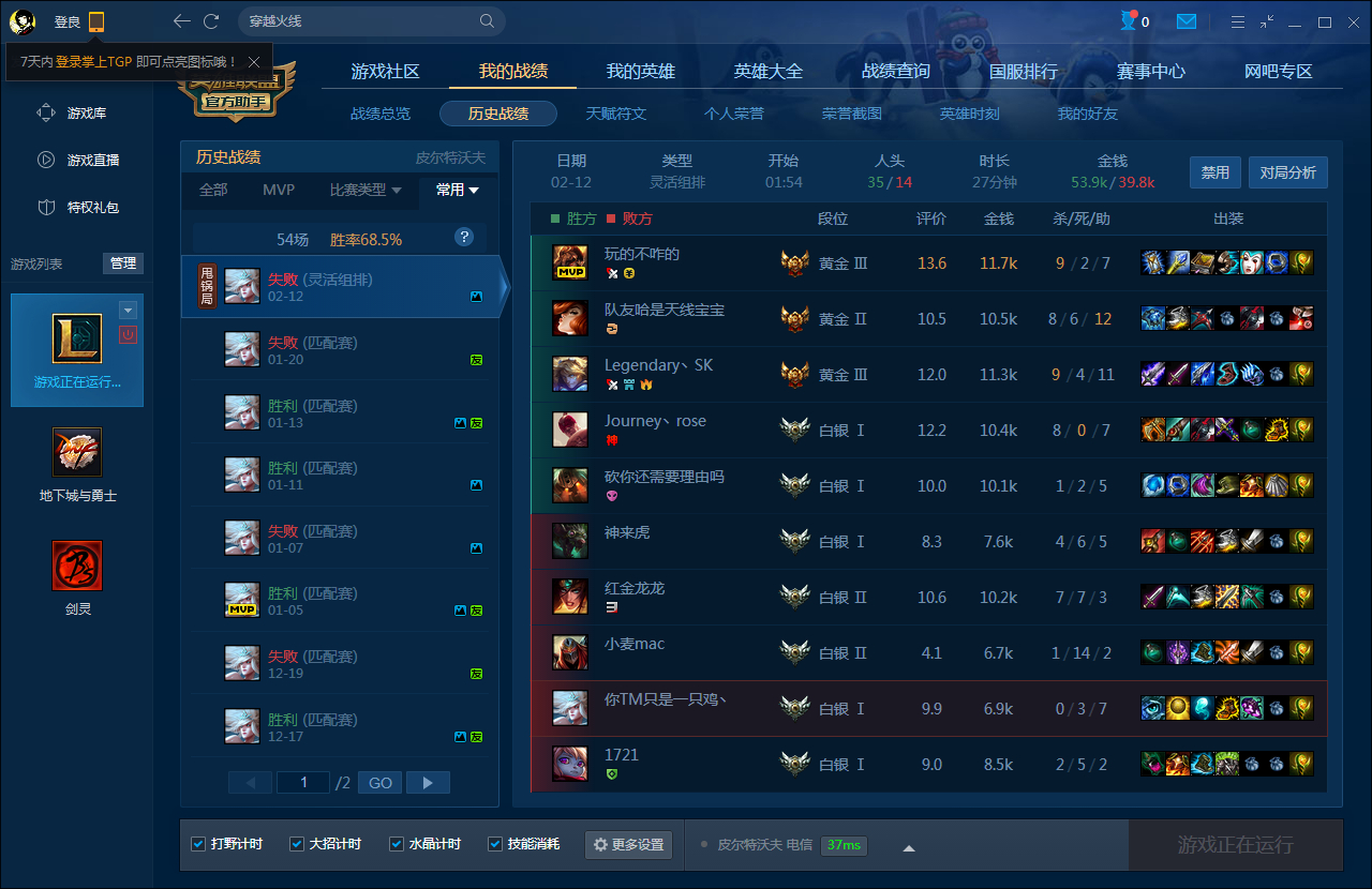我辅助基本胜率都在60.现在白银1,求一个会玩的ADC跟我一起上分,可以语音!然后本命是金克斯
