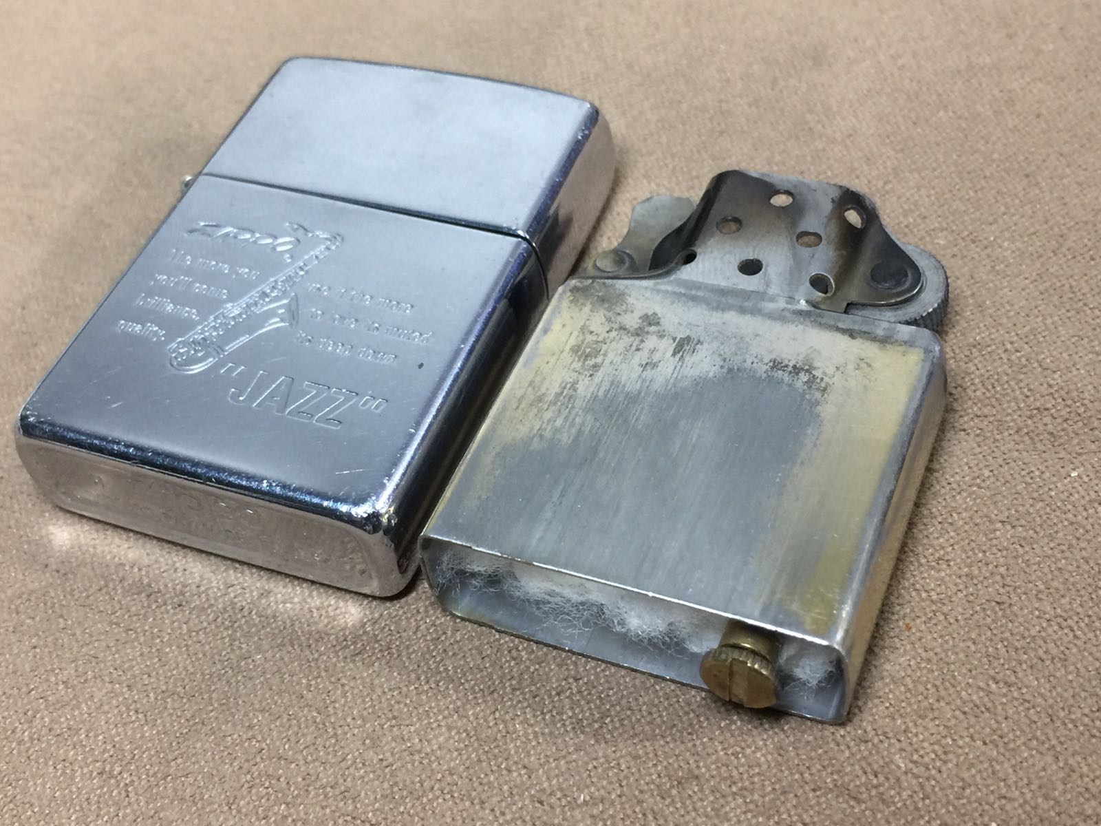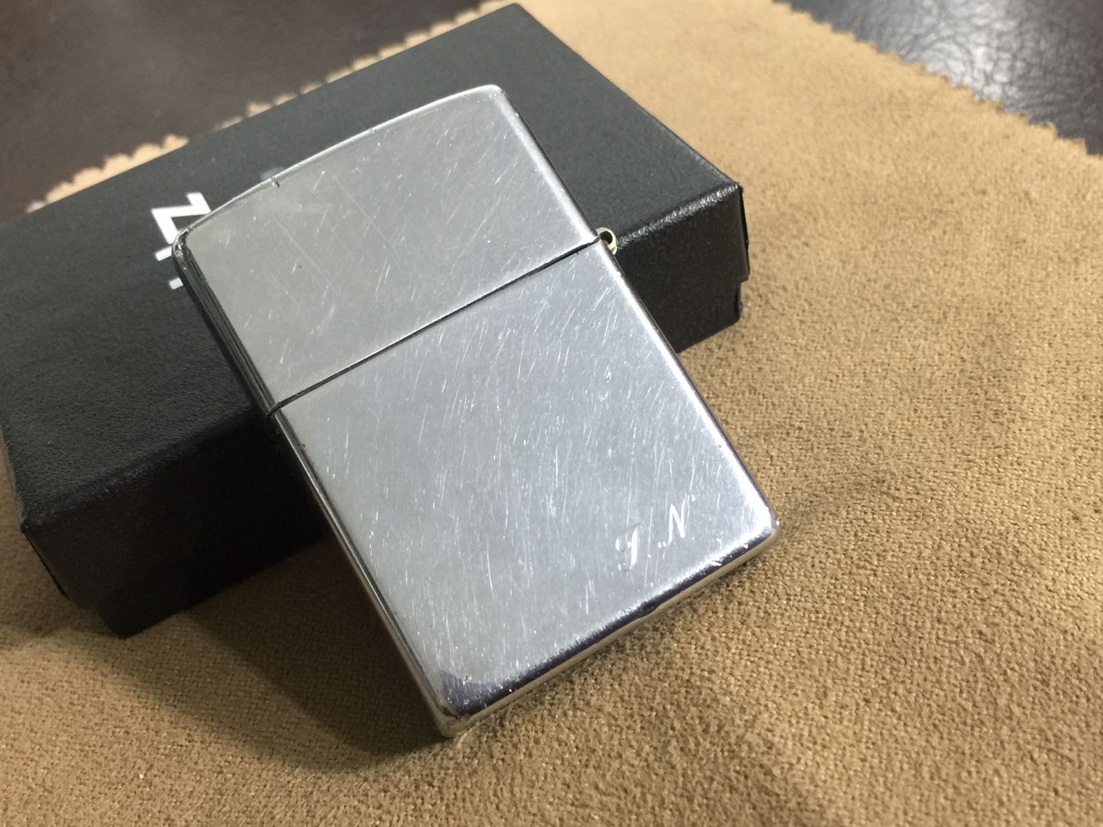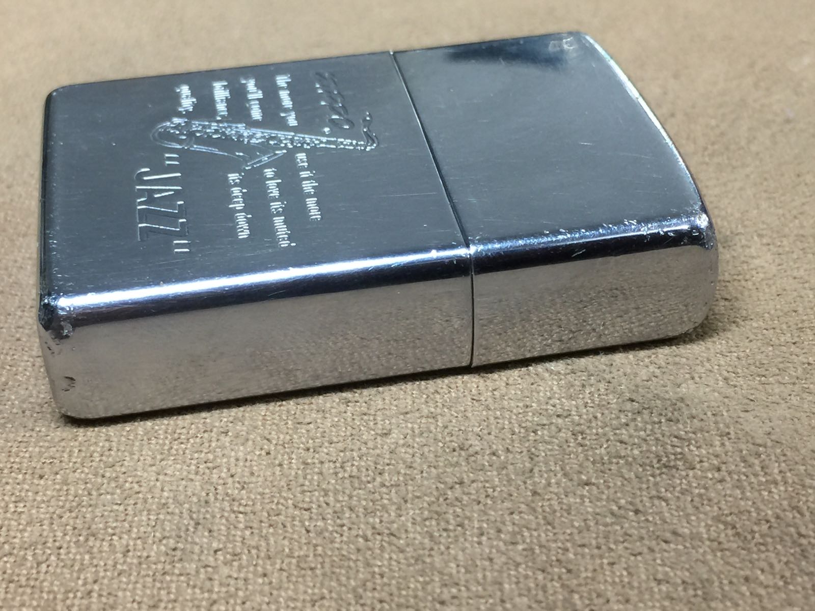 【具体描述】二手1994年8月 镜面蚀刻工艺 萨克斯。机身较强使用感,背面刻字,顶部有凹陷,边角磕碰多,定义差品,铰链略松,后配金胆年月刻印磨损不清,打火强,无底毡,火石弹簧无顶针(装两粒火石即可)无包装。