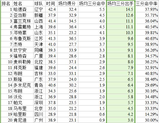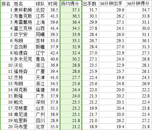 由于4节6人次的外援政策,每场比赛两名外援出场时间的总和是72分钟(亚外不影响另外两名外援上场),平均一人36分钟。而我们可以看到有15名小外援的上场时间都超过了这个数字,说明我们联赛大多数球队还是以小外援为主。其中哈德森、富兰克林和布鲁克斯位列三甲。得分榜