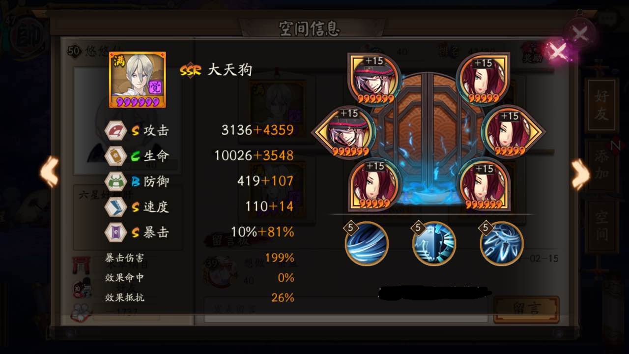 另外加上标配1打火1兔子,都是4星,打火机,调了以下速度在狗与鸟之间行动,165速兔子,就这样子了,两个的御魂基本上都没什么升,也就勉强能扛住大蛇一下这样子!