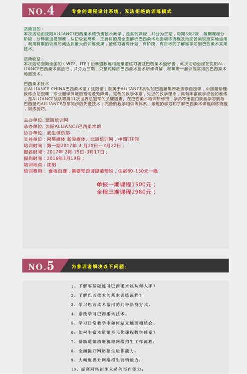 特别针对itf/wtf跆拳道馆、空手道馆及其他站立项目道馆的教练们,去年开始很多道馆都开始了转型,巴西柔术属于地面技术,与原有站立项目不冲突,对象人群以成人为主,助力儿童学员为主的道馆多元化发展。