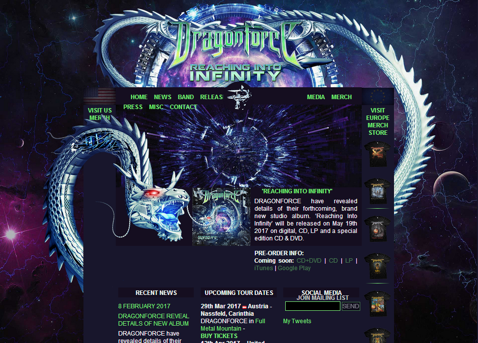 DRAGONFORCE日前披露了他们即将面世的新专辑——《抵进无限》(Reaching Into Infinity’)的细节。此专辑将在2017年5月19日开售,分为数码版、CD版,LP以及特别版(CD+DVD)四种。新专的大部分录制工作是在位于瑞典的Fascination Street 工作室完成的,这次的出品人是 Jens Bogren,,在乐队为他们的精选集《铁血精英》(Killer Elite)导出巡演的途中他们也做了一些新歌录制,分别完成于伦敦的 Lamerluser 工作室,威特尼的 DarkLane 工作室,也到法国的Evil1工作室和美国加州的ShredforceOne 工作室留下了些脚毛。.