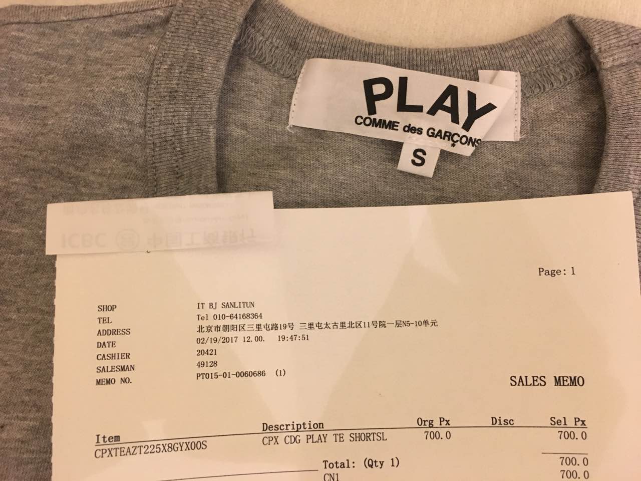 之前没买过play,最近想换换风格,就去三里屯IT买了件T,结完账之后店员包装的时候问我要不要留标签,我说都可以,然后她就帮我把标签剪掉了。刚才发现签都定歪了,但是又是专柜,不知道怎么解释。