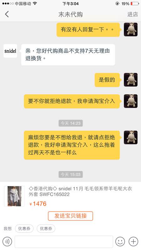 在淘宝上一家末未代购家买了翻领大衣,到了发现是假货。连吊牌都没。希望谁有正品的细节图还有水洗标给我发一下。我要申请淘宝介入。