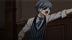 小野 评价很低呢(笑)。不过如果葬仪屋没在《豪华客船篇》登场的话,就仍然只是一个“不知为何有点搞不明白的人”了。在《黑执事》里毫无疑问能划进最强的部类,拥有着压倒性强大的、压倒性的“恶”。“在那里,是两人即将面对的(对手)”,该说是某种意味上少年漫画里王道的有趣之处吗。虽然很不甘心,但葬仪屋真是帅得不行啊。