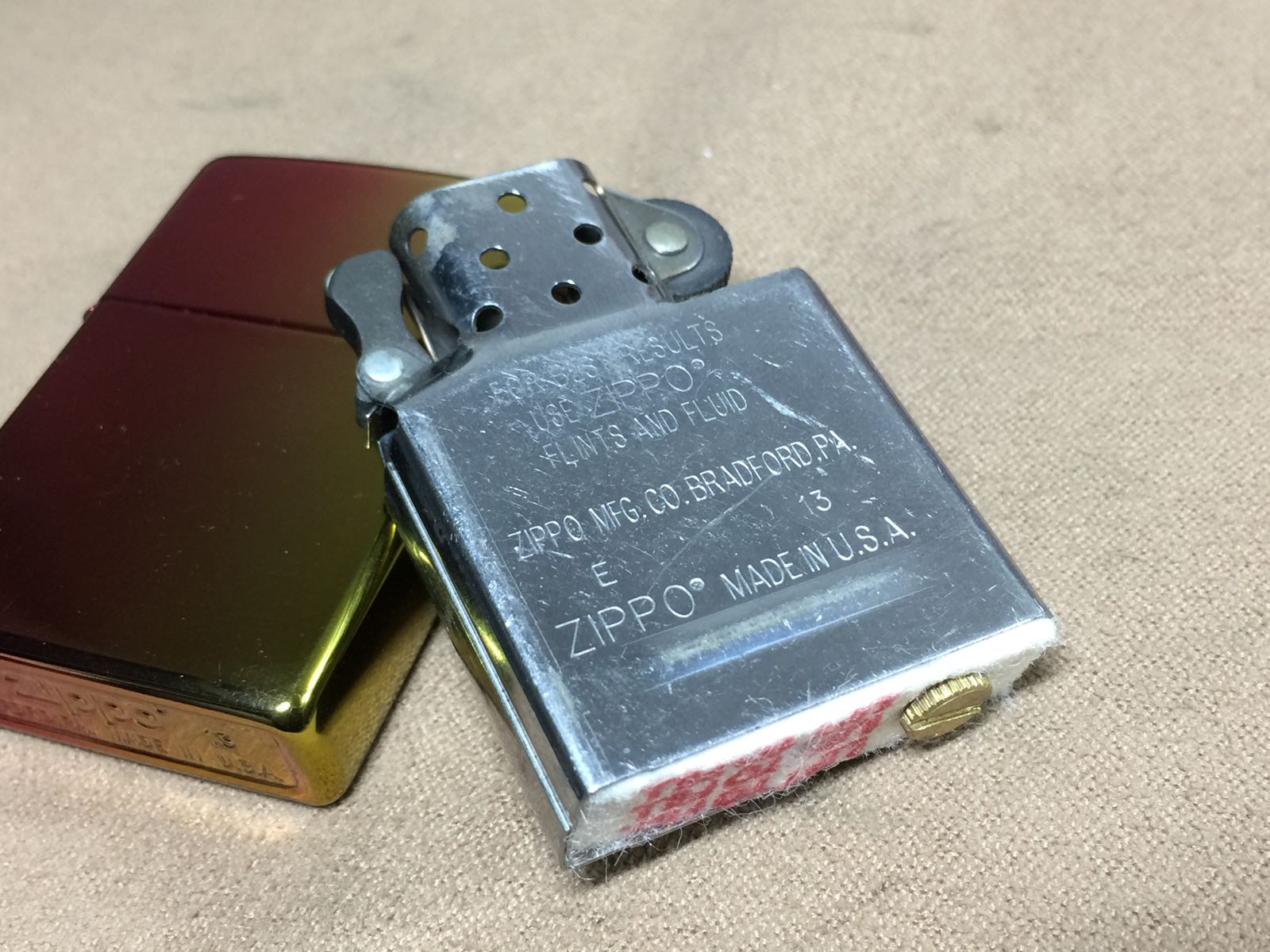 【具体描述】二手2013年2月 渐变色镀钛机。机身正常使用擦丝擦痕,局部轻微磨损痕迹(强光拍出,正常角度不明显)顶部一处小磕点,侧面一处针眼 均微距拍出,定义二手一般品。铰链正常,原配13E内胆打火强劲,无包装。