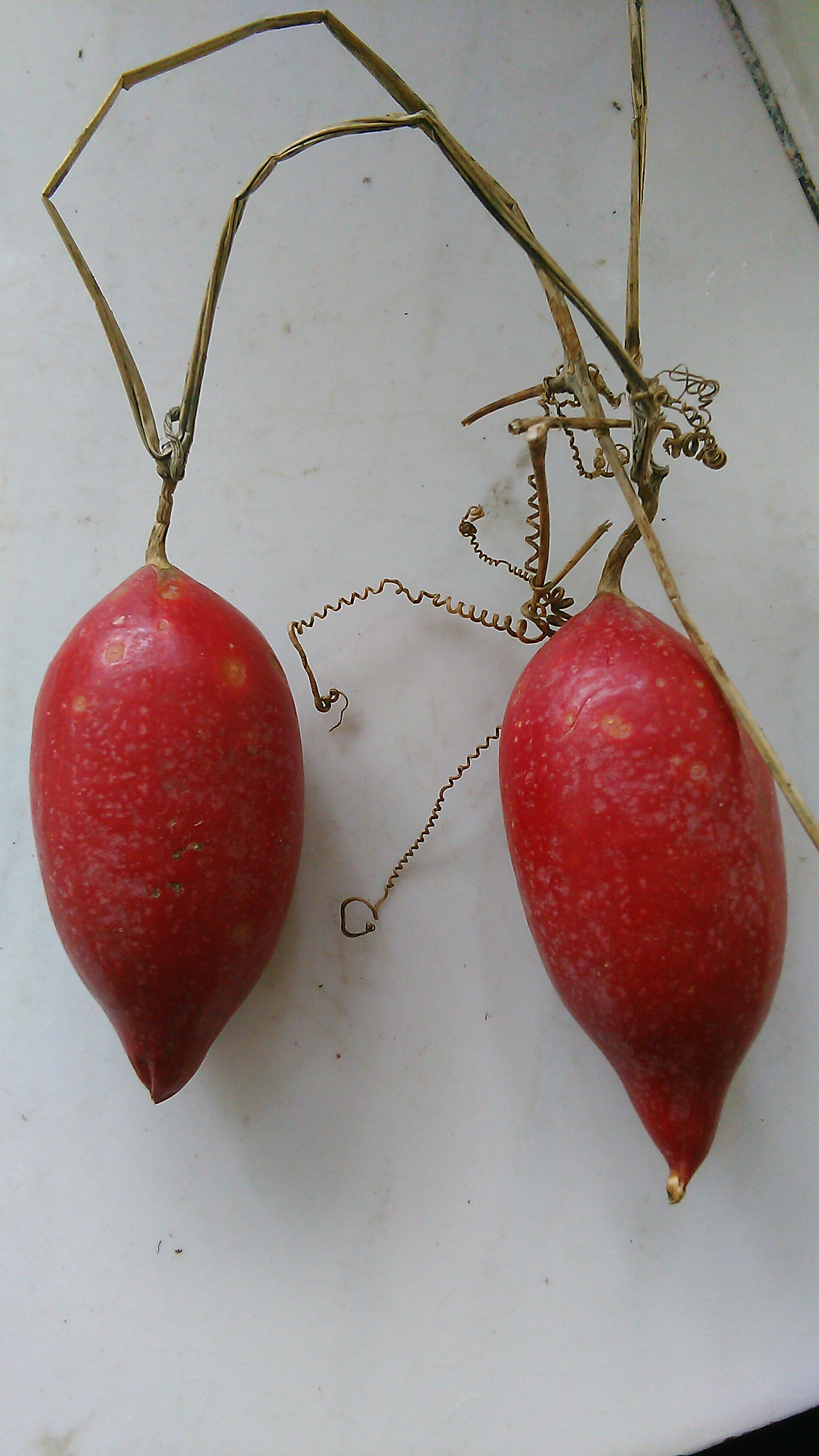 我是云南人,在街上看到一果实很好看,买来想种了观赏,可不知道叫什么,在网上查询,从果的形状、颜色、种子来对比看似“王瓜”。可网上的王瓜剖开里面都是黄色的,而我买的却是红色的,请大家帮看看是王瓜吗?谢谢!