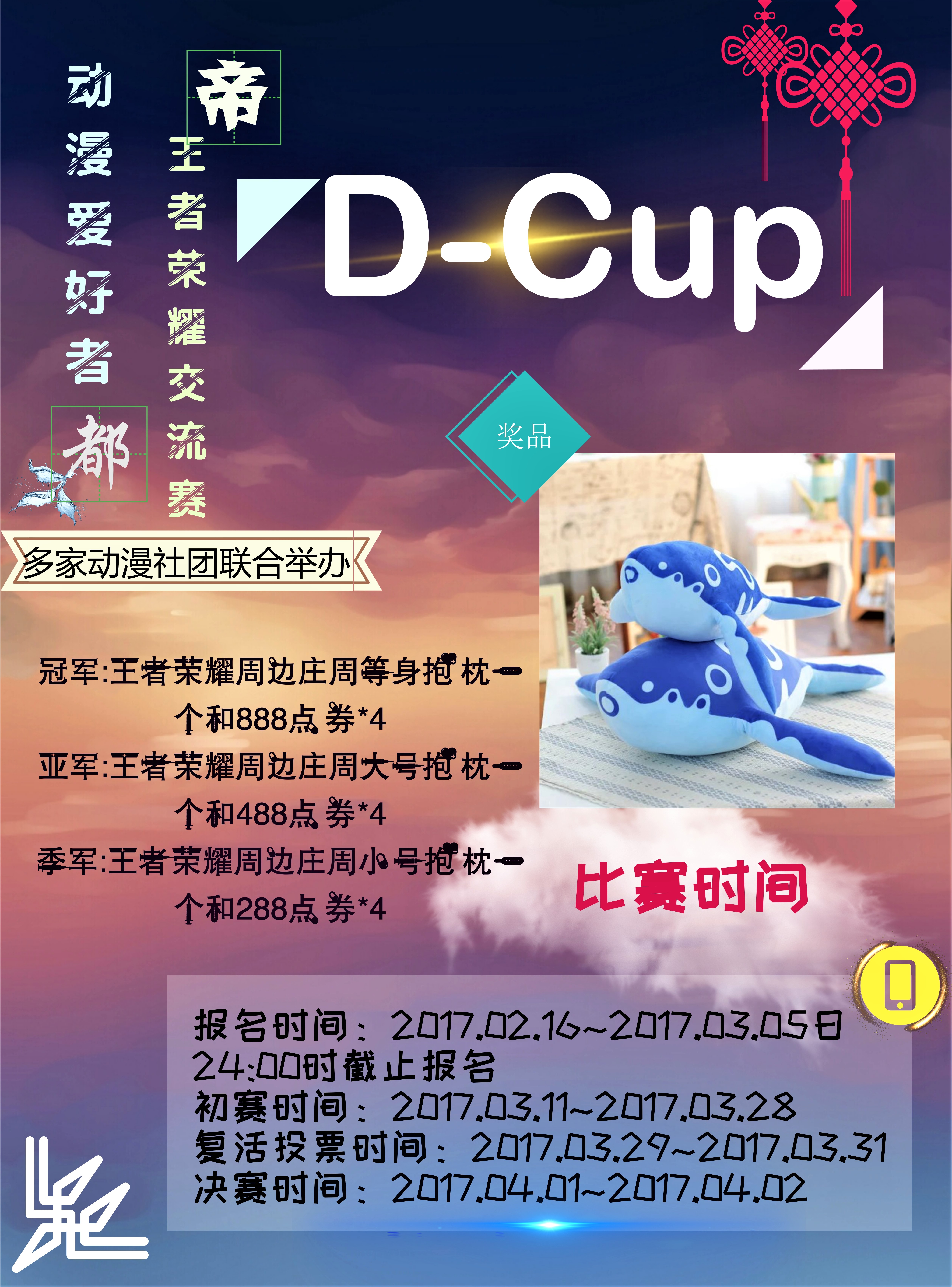 由多家高校动漫社团联合举办,属于我们二次元圈的首届D-Cup王者荣耀交流赛正式上线!!!听起来有没有很心动呢?带上你的基友和妹纸一起来D-Cup欢乐的玩耍吧!!!首席媒体