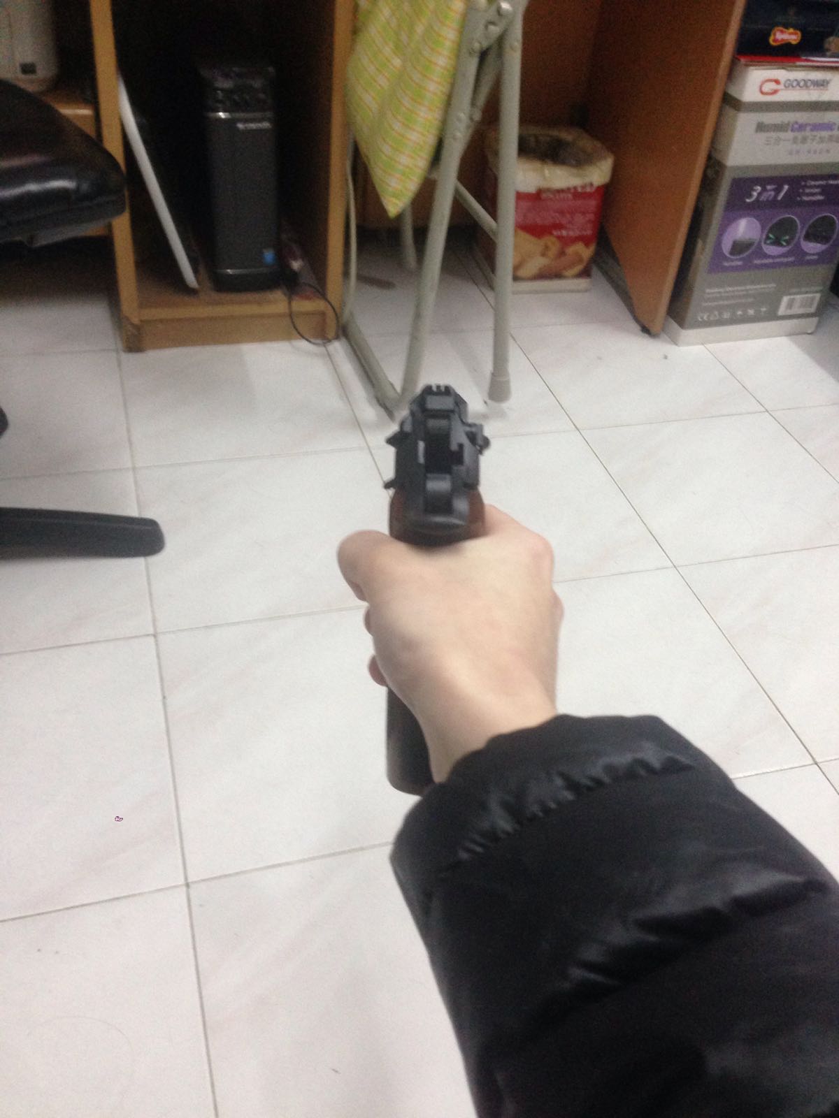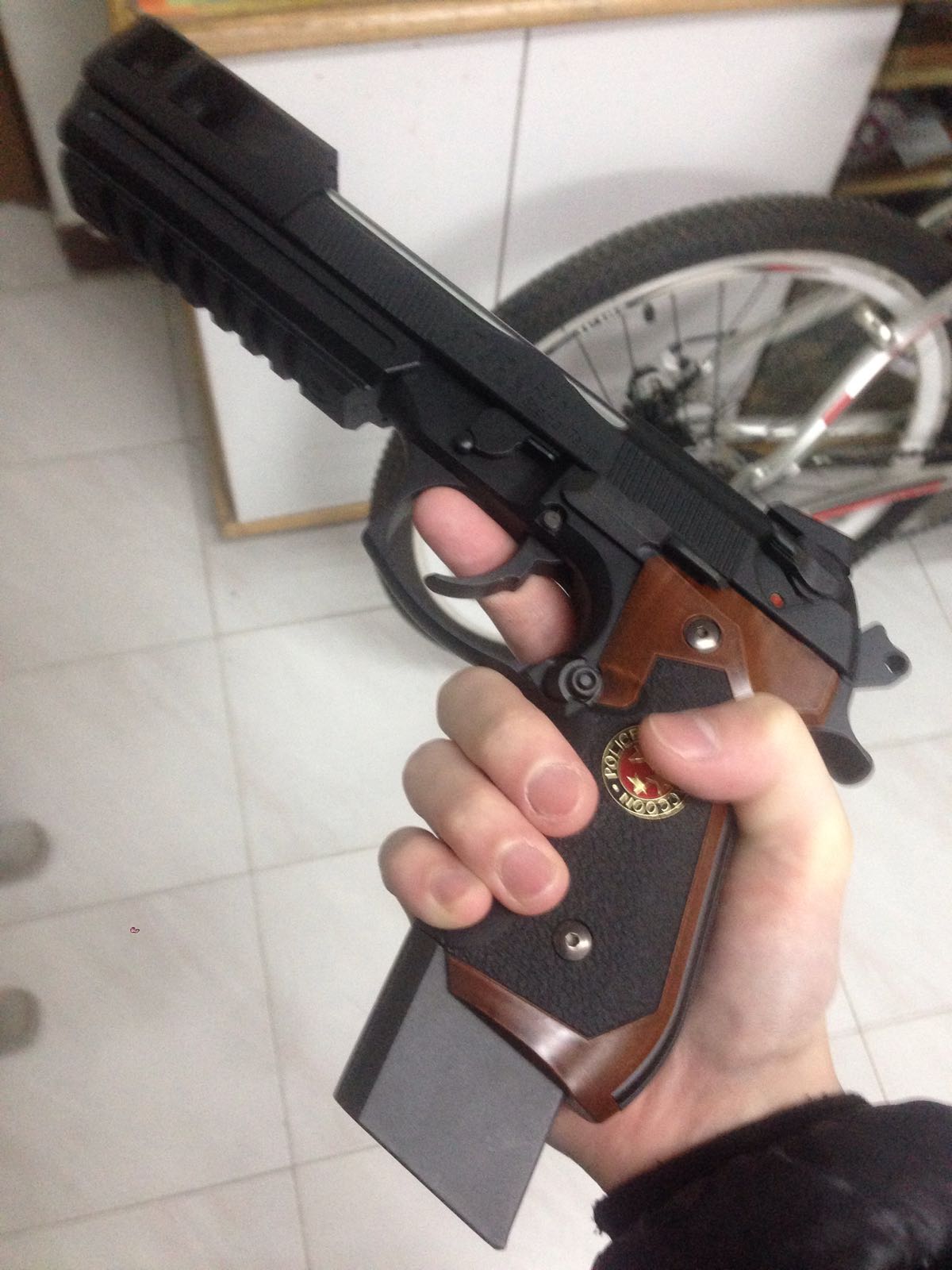 別看氣槍好像很輕,它可是金屬材質造的,拿起手來很墜手