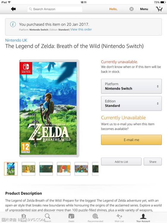 每次上架都被预订一空的主机本体和一张难求的《荒野之息》大师版和特别版已不用提,如今全球最大电商、全美消费者最满意公司亚马逊在美国区和英国区的该游戏商品页面,就连标准价60美元的实体普通版都已显示无法购买,在亚马逊的游戏栏目里堪称历史首次。