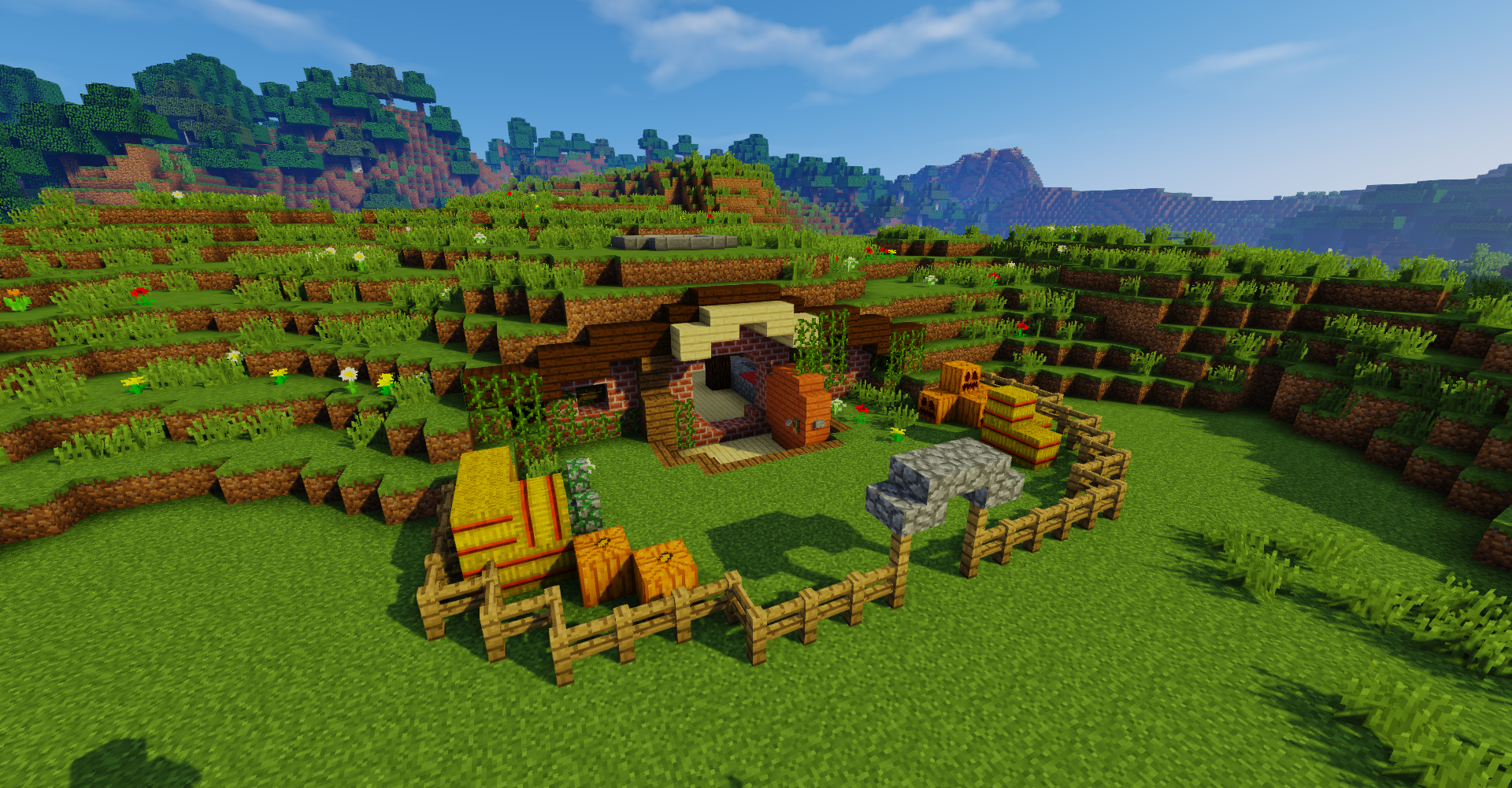 外部增加了干草垛和南瓜堆,放了两个拴马的柱子,给旅店加了门