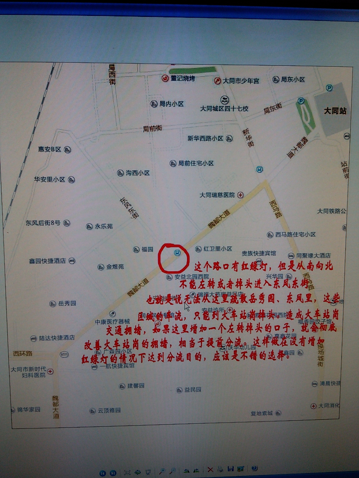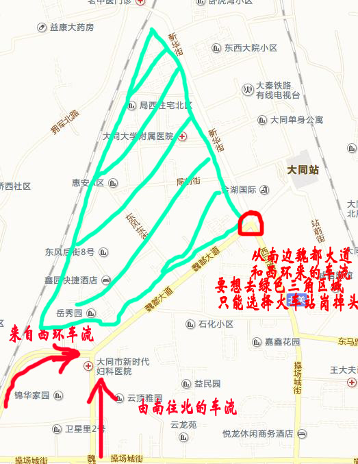 火车站岗的拥堵情况在大同是比较有名的,我通过分析得出,应该打开魏都大道与东风东街交叉点,容许从南面来自魏都大道和西环路叠加车流前往岳秀园、东风东街附近福园小区,沟西小区,华安里等左转或者掉头。我们通过图可以看出,上面这些小区都是人口密集居民区,他们从南边回家,现有的条件只能是到火车站掉头才能实现的。