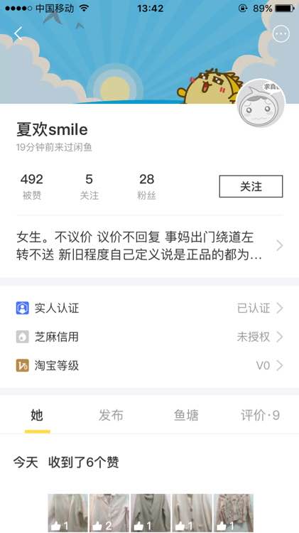 非常老练的倒卖行家啊 卖出的东西都删除 状态也删除的很干净 估计平时净在咸鱼捡二手白菜穿 穿腻了再挂别的号出掉 即使不能赚上几笔 免费穿衣服也不吃亏不是