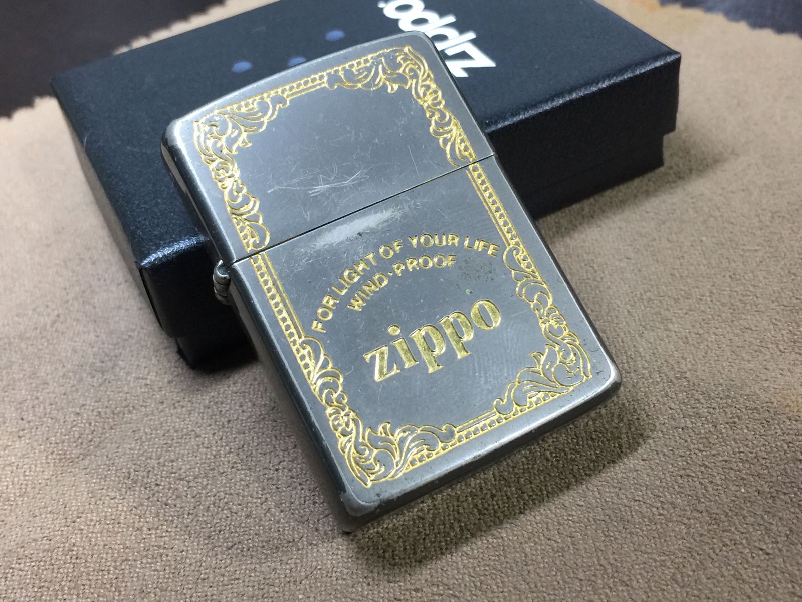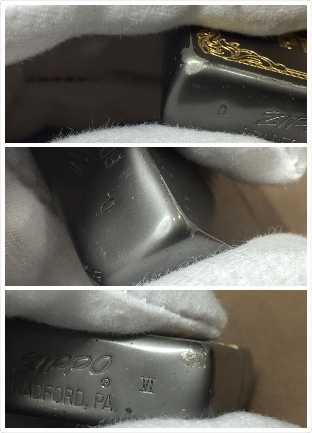 【具体描述】二手1990年4月 烤漆蚀刻填金工艺 小斜底。机身烤漆层较多磨损痕迹,底部几处磕碰微距拍出,定义差品。铰链正常,原配91A内胆打火不错,无包装。
