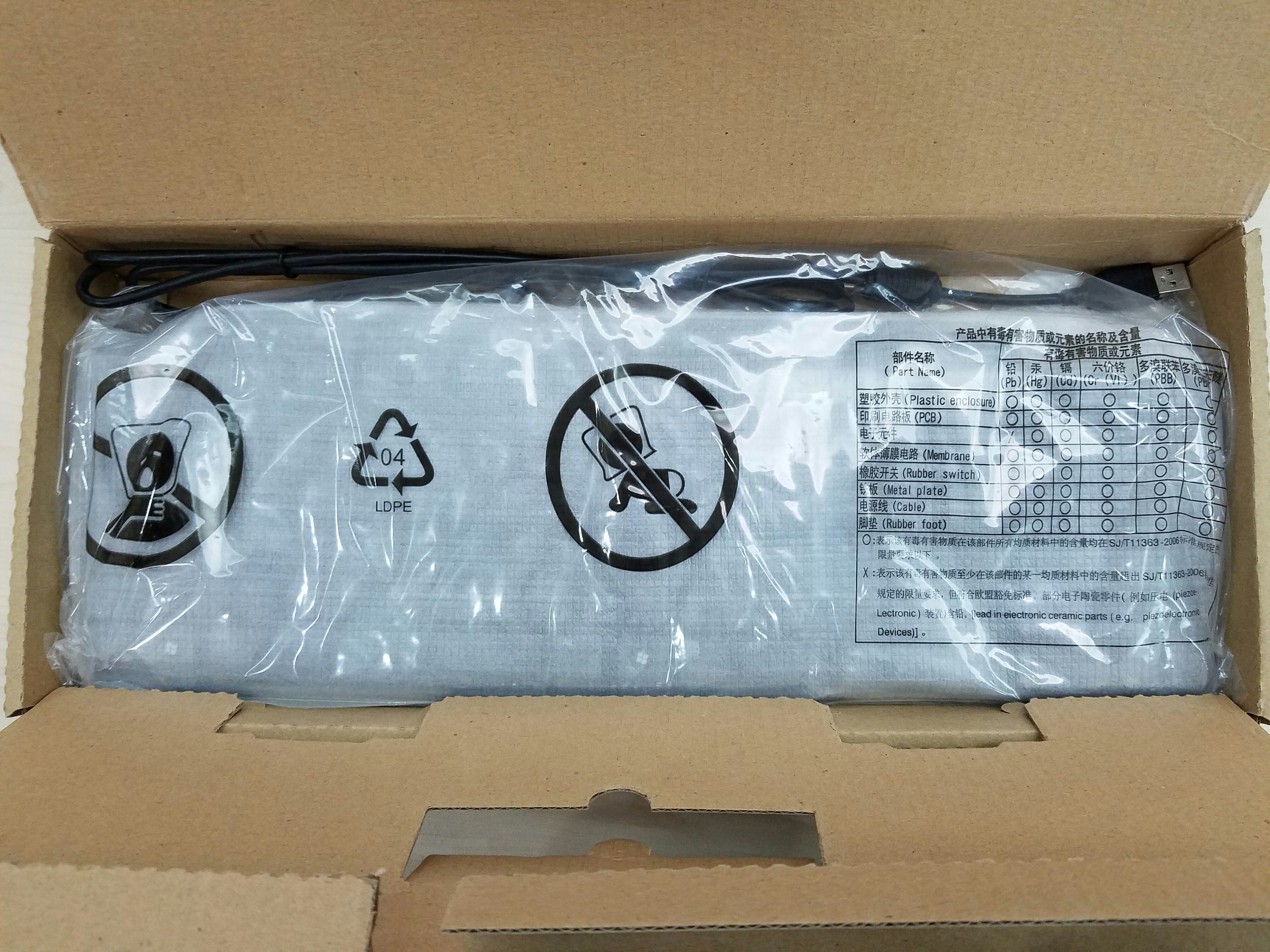 USB插头全新的,没有插痕,抗干扰磁环也不可或缺,线要比目前市场上的键盘要粗一些,
