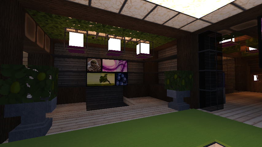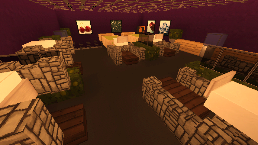 原本是打算做霍比特风格的,结果做着做着就拐到现代风了,主体结构基本没有太大变化,材料以木板和石头为主,配有大量灯饰玻璃树叶,整体颜色偏暗,12间客房,6间功能性房间,就这么多了,其实内容挺少的,客房长得基本都一样,就是换了个颜色