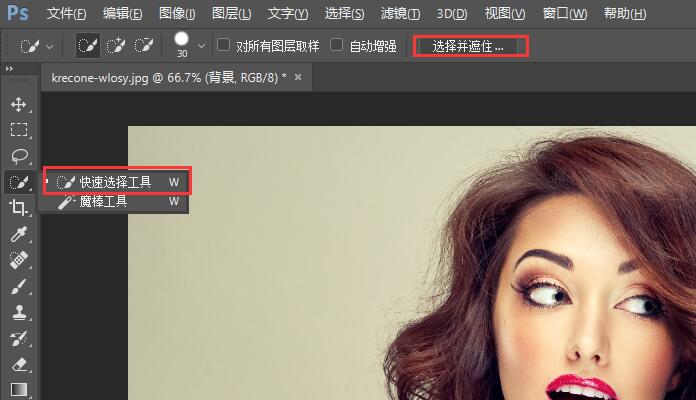 1.从选择开始,先快速选择工具,然后从选项栏中选择选择并遮住。
