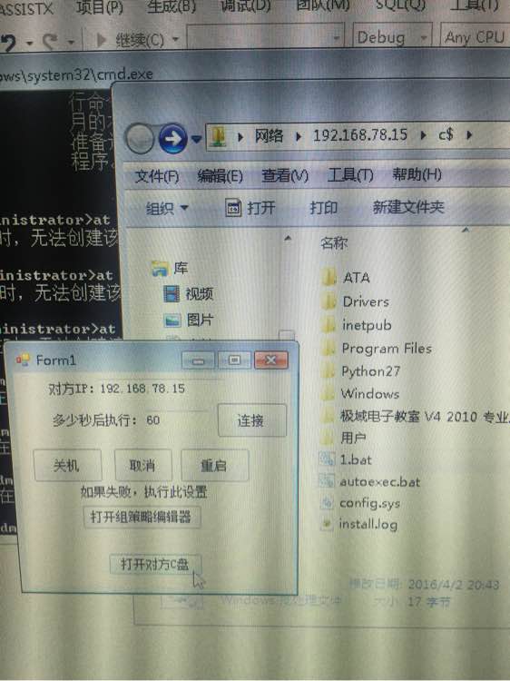 是这样的。我想连接局域网的另外一台主机,已经通过建立连接,映射到了对方的c盘了。现在的问题是如何在对方的电脑上运行bat文件或者exe文件?是在我连接的电脑上运行,不是本机上运行。我试了at,不得行呀