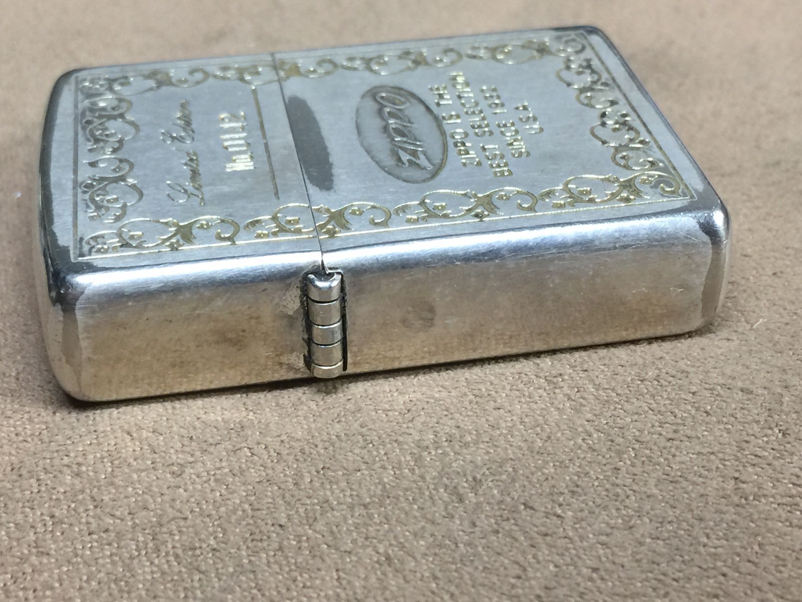 【具体描述】二手2003年8月 限量雕花Z标。镀银底板蚀刻填金工艺,机身编号0142。整体较强使用感,镀层局部磨损 氧化,边角有磕碰和针眼,无大伤,定义差品。铰链正常,原配02D内胆打火不错,无包装。