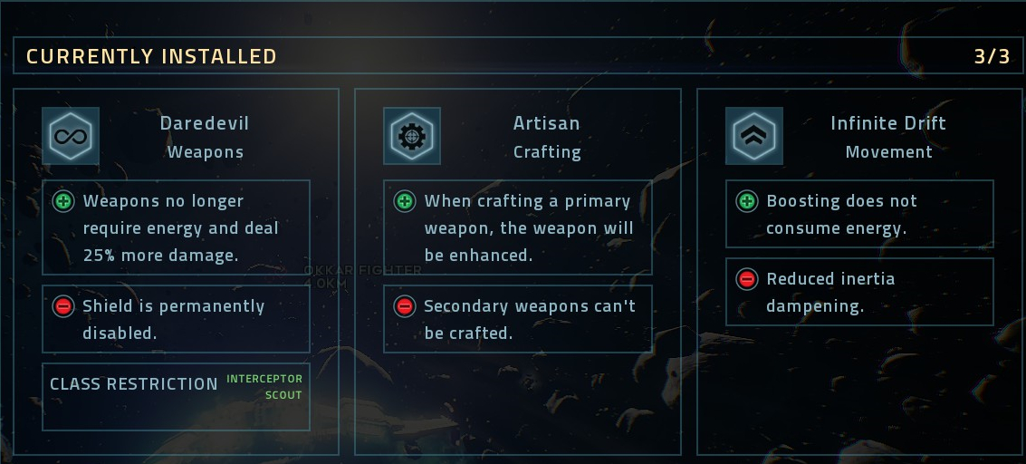 第一个:蛮勇:使用武器不需要能量,但是没有护盾第二个:工匠:制作的MK1型武器自动升级为加强版(带☆的武器),但是无法制作MK2武器