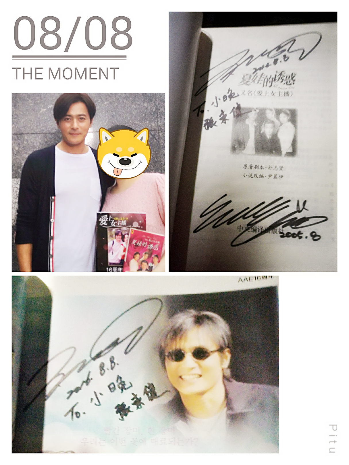 我拿纪念册,问他可不可以写上“TO小晚”,他笑,然后照着我提前写好的纸条上面的“小晚”两个字描画了起来。有个有趣的小细节,我不是写了个纸条“小晚”吗?我本来就夹在签名页上了,东健照着那个刚要往他和蔡琳图像的中间位置写,然后我伸手把纸条拿开了,我的本意是不要影响他写字,因为纸条遮挡了一部分签名图片,而东健居然马上换了签名位置,依旧把蔡琳签名的地方规规矩矩空出来!!东健!!我一定不会辜负你之心意!!一定会把蔡琳的名字签来的!!!