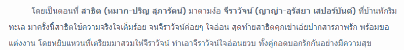 这场戏是在位于巴蜀府Pranburi县的一家美丽度假村拍摄,是一场Mark与Yaya开始轻松起来的戏,因为这是全局的大结局,但还是得要承认有各种情绪和细微之处,还是很难。Mark甜蜜动情地向Yaya告白,令Yaya无比动容,泪水盈眶,因为她深爱Sathit已久。