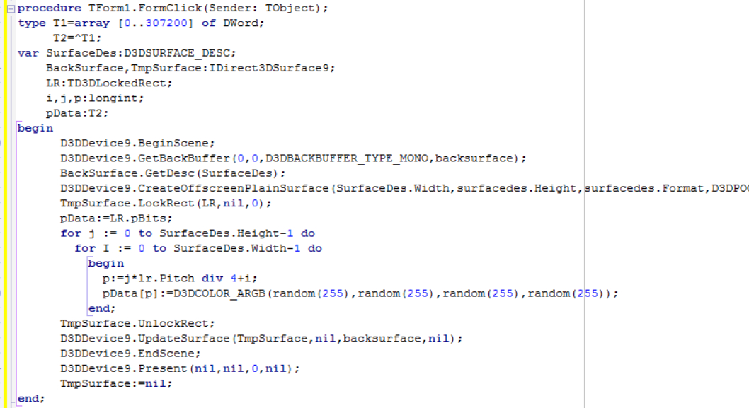 PS:这个其实不需要在创建一个surface,直接修改backsurface LOCKRECT的数据就可以了。PS2:T1里的数组上限你自己根据SURFACE的大小去算,我这个是按640x480做的。