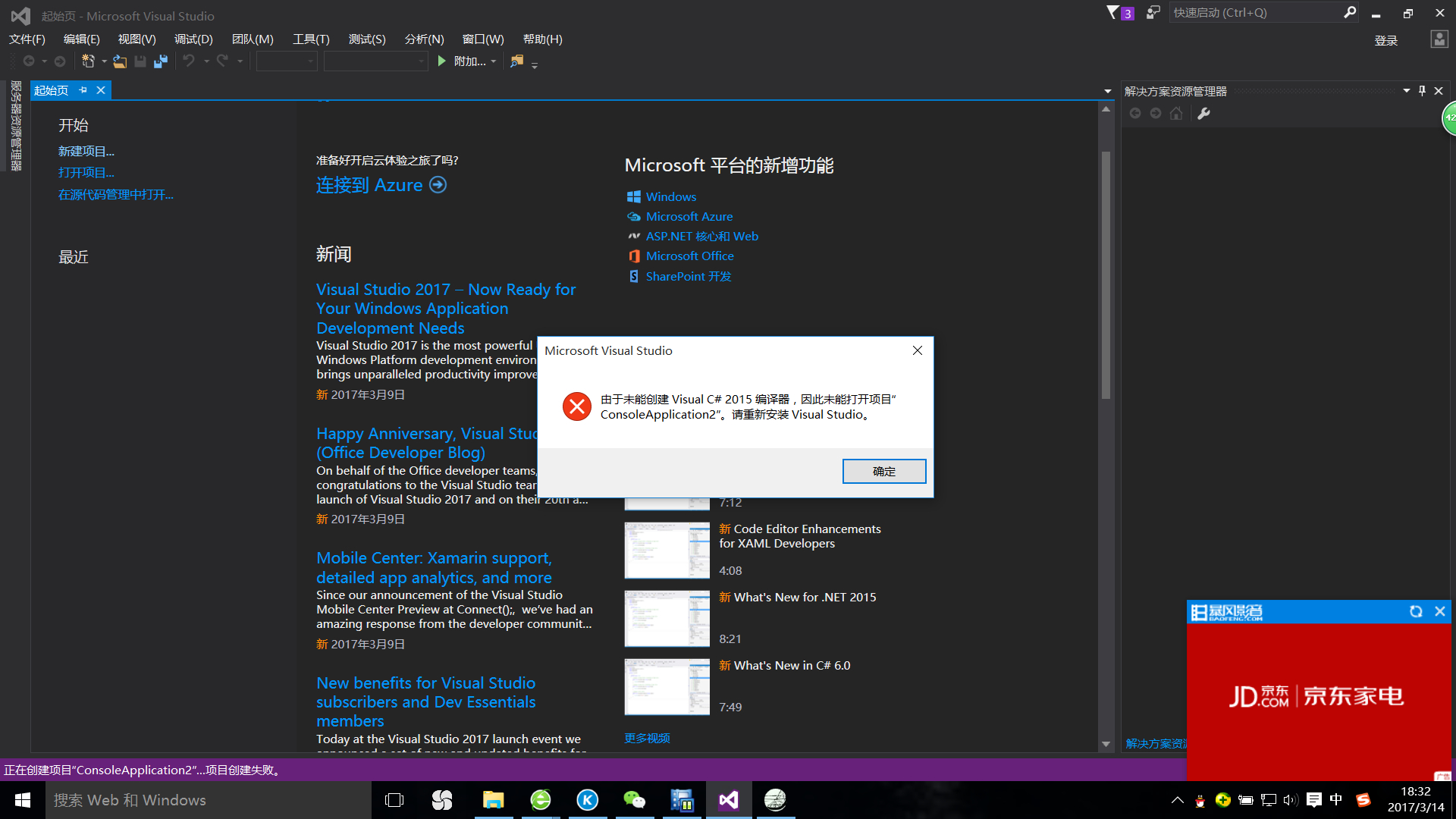 vs2015创建新项目失败,请问怎么解决,实在不行就重装了