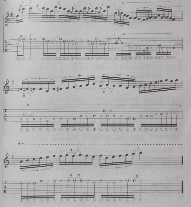 这是一本老教材里的乐句,我之所以推荐给大家,是因为这个段子特别风格化,特别有自己的腔调。一个作品,无论是美术的还是音乐的,最怕就是含糊不清,在吉他创作中,大师们即使只有四小节solo哪怕是一个过门儿,也会做出味道来,三流吉他手或者不入流的吉他手,即使给一百小节的solo也会搞得乱乱糟糟不知所云,这就是差距。小段子之前已经发了四十二弹了,这个比之前稍微长一点儿,设计稍微复杂一点儿,其余没啥。最重要的就是品味其中的滋味,大家都来尝尝,看看味道如何。看着有点儿晕,其实这个不难,我推荐的也都不难,因为咱们先来简单的。