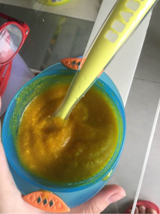 南瓜三文鱼泥迷糊。七个月开始加肉肉。要么就山药牛肉 土豆牛肉 土豆猪肉等