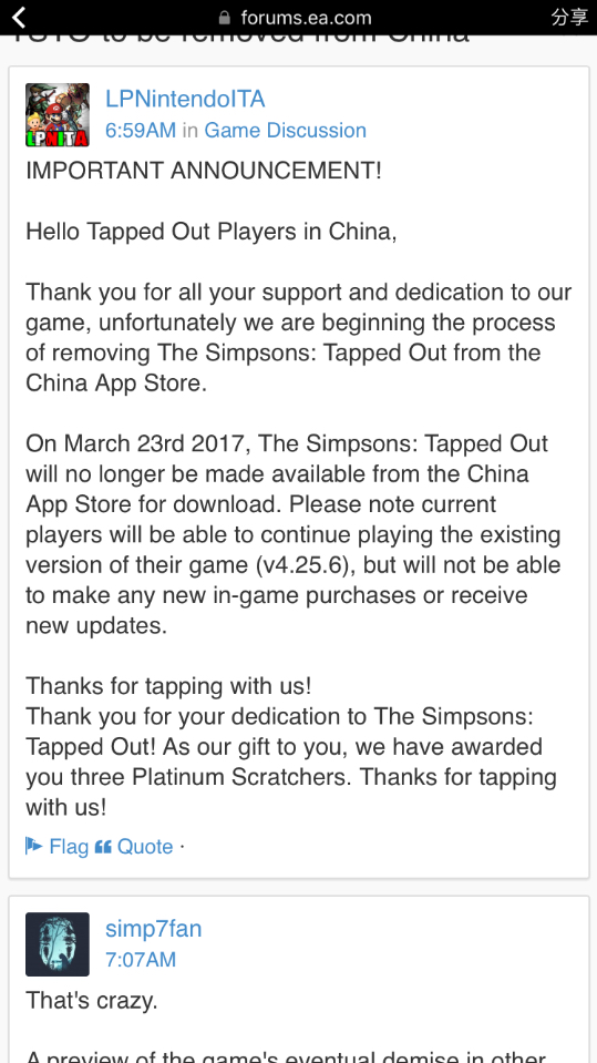 我看了一下跟帖,基本上都是外国人的跟帖,他们也很好奇下架的原因了。有说是因为EA准备停掉这个游戏了,也有说中国因为zhengzhi的原因下架了所有南韩的游戏,所以辛普森也是因为这个原因下架的。不过EA官方并没有说明具体原因,所以他们的回复也都只是猜测而已了。