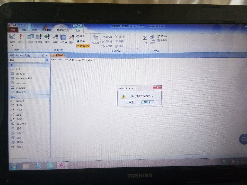 就是用sql修改字段类型时,出现了“对象无效或不再被设置”的字样,运行不了,我写的是“Alter table 学生表 alter 学号 char(8)”