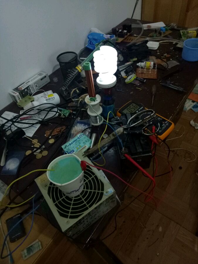 12v电瓶带zvs带变压器升压整直输出过自来水电阻限流到手机充电器给特斯拉线圈供电,然后点亮节能灯