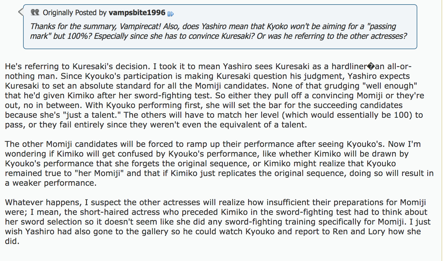 这些女演员提到想起京子演了未绪和小夏,惊叹这两个角色不同,那个注意到京子闭上眼睛的女演员提到在第一版《月笼》里面演未绪(在Dark moon演妈妈, 名叫Iizuka)的人在开拍第一天刁难未绪。但京子让她住口了。其他人惊叹这不可能,Iizuka很严格的什么的。然后注意到京子闭眼女演员继续说听到传闻是京子让Darkmoon里的未绪设定改成短发的,其他女演员觉得太夸张了根本不可能。