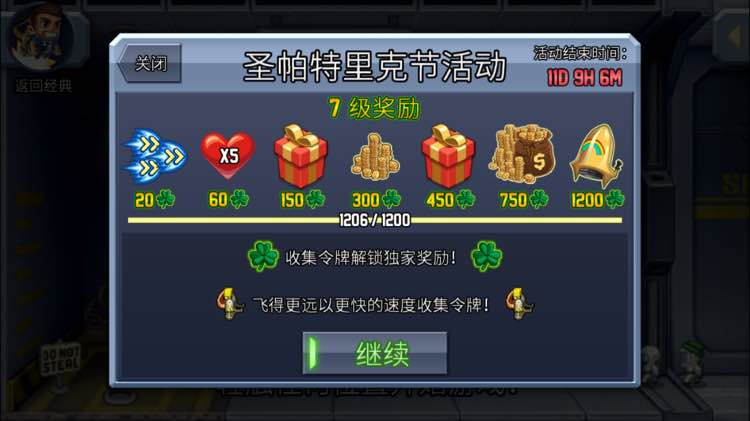 一开始花钱买了解锁包,开了绿色套装、金罐彩虹背包和绿色的传送器。然后那个黄金彩虹背包就要收集1200个绿色三叶草了,还好,每个阶段的收集都是累积的,比起上次的几千个南瓜头算是客气多了。
