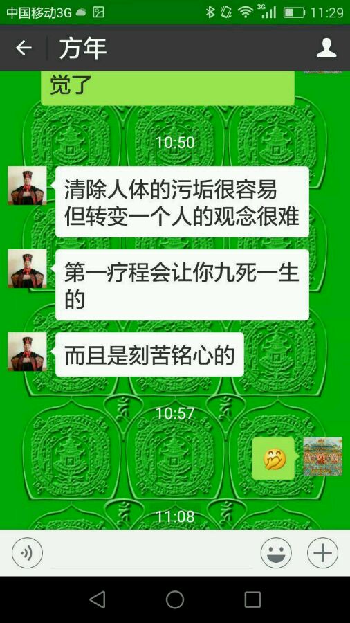 4月8日第七次调理,这次疼点很少,小腿下疼,上腹心脏按点疼,左大腿根疼,屁股两侧疼,脖子右边疼,腰略疼!后背很舒服,一点不疼。肚子一点不疼。肚子上部,一些点疼,穴位输入流很舒服,很奇妙!身体上面好多疗法我不知道怎么描述,都是很舒服的感觉,有些点有声音,似乎是水声。腿上的三阴交穴位每次没感觉,这次很疼,从两点发出热流入小腹。肚子弹跳疗法,肚子热,感觉自己很薄像一张纸,不是每次的几个支流,是一个粗的输入流,入胃!方师兄每次调理针对患者,采用相应的手法,都是不同的,感觉也有所不同!调理后很轻松,身体比以前明显好转,气色也比以前好了![胜利]感恩方师兄![抱拳][抱拳][抱拳]辛苦了!方师兄!